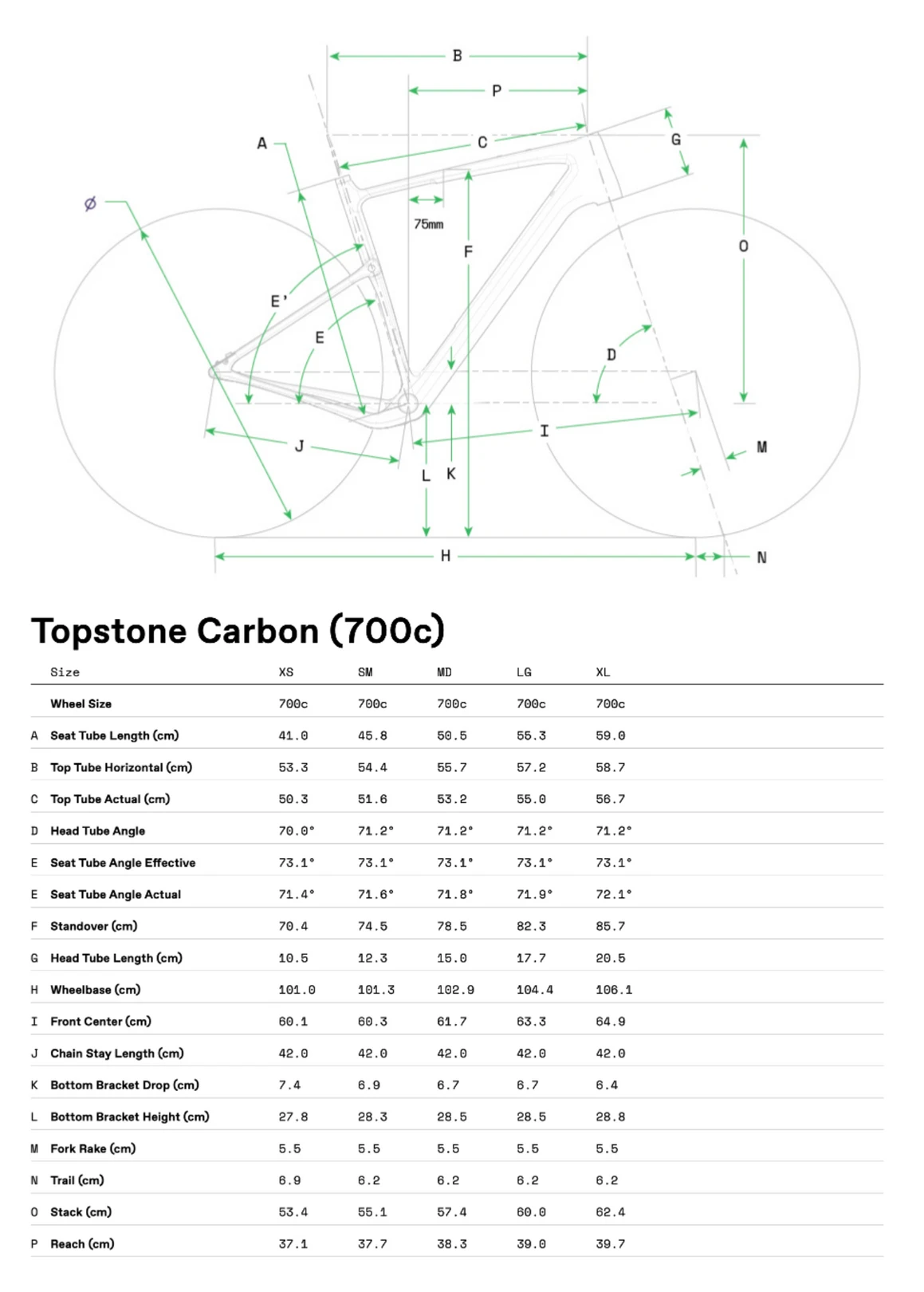 Topstone Carbon, 1-1/8″ to 1.5″ steerer, 55mm OutFront offset, flat mount disc, internal routing, 12×100 thru-axle, triple bottle/gear mounts, fender mounts